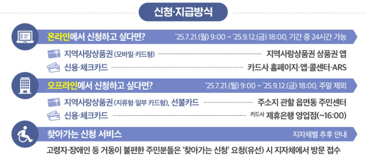 - 온라인: 카드사 및 지역사랑상품권 홈페이지, 앱, 콜센터, ARS // 25.07.21(월) 9:00~25.09.12(금) 18:00 기간 중 24시간 가능