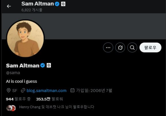 전체 수익의 약 75%가 챗GTP의 개인사용자 유료 구독서비스에서 발생한다는 오픈AI. 챗GPT 지브리 스타일 이미지 생선은 이런 오픈AI가 2025년 3월 25일에 GPT-4o모델을 기반으로 한 새로운 이미지 생성기능을 도입하면서 큰 화제를 불러오고 있습니다. 이미지나 택스트 설명을 넣으면 일본 유명 애니메이션 사인 스튜디오 지브리의 애니메이션 스타일로 이미지를 생성해 준다니... 인기가 없을 수가! 오픈AI의 CEO인 샘 알트먼 먼저 재빠르게 X프로필 사진을 지브리 스타일로 바꿨네요 ^O^